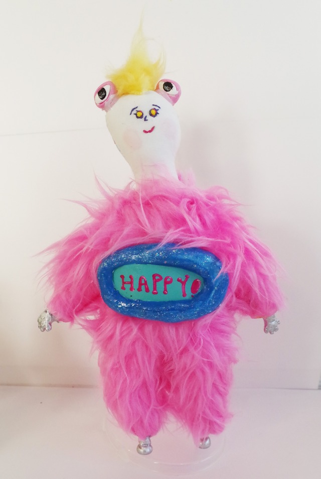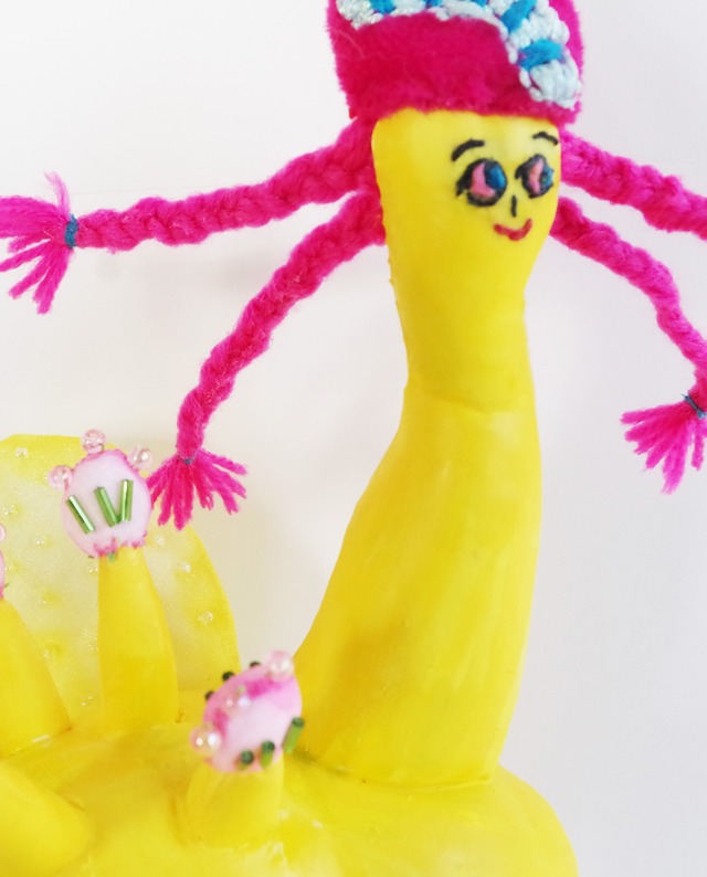 こちらはワクワク星人の中でも感情的に制作した作品です。 胴体部分も顔も元々は違う作品として制作部屋に存在していました。 でも、顔がある日から「ボクはあの黄色の変な体と生きたいんだ。きっとボクとアイツは気が合うと思う。」そんな風に聞こえてきました。 しかし、私はあまりにも突飛な生き物になってしまうことを嫌悪しました。 13年作品をつくり続けていつの間に保守的な感性の方が強く主張するようになっていました。 でもボクの顔をボクの希望通りに合体させてみたら、「いいじゃん!」 たったそれだけの久しぶりの感情でした。 感動や生命力を感じてもらう事も勿論私の使命ですが、 ただ色と素材とフォルムが楽しいと感じる重要性。 自由に楽しむことを大切にしていきたいな。 と教えてくれた作品です。 size(約)/h24.5㎝・w10㎝・10.5㎝